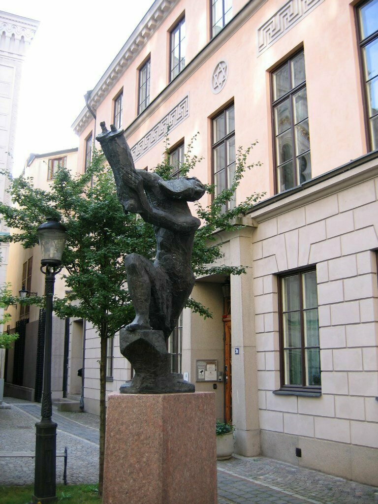 The Great Synagogue of Stockholm. It was built in 1867-1870 by architect Fredrik Scholander in the Moorish style. The Great Synagogue belongs to the egalitarian conservative trend of Judaism. This is a liberal trend in Judaism, occupying an intermediate position between Orthodox and reformists, with special attention paid to the equality of men and women. Men and women pray together, in the same room. Since 2015, the chief Rabbi of the Great Synagogue has been a woman. The other two synagogues in Stockholm belong to Orthodox Judaism, where such liberties are not allowed. Very strict security rules are observed in the synagogue (given the current situation in Sweden, there are probably grounds for this). You can't even enter the courtyard, surrounded by a high fence, from the street. Tickets for the visit must be pre-ordered online no later than three days in advance. On the street next to the synagogue there is a sculpture depicting a refugee with a Torah scroll (1986).