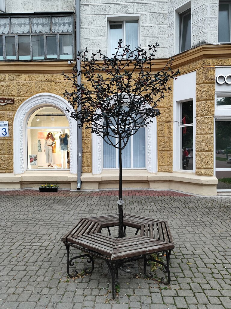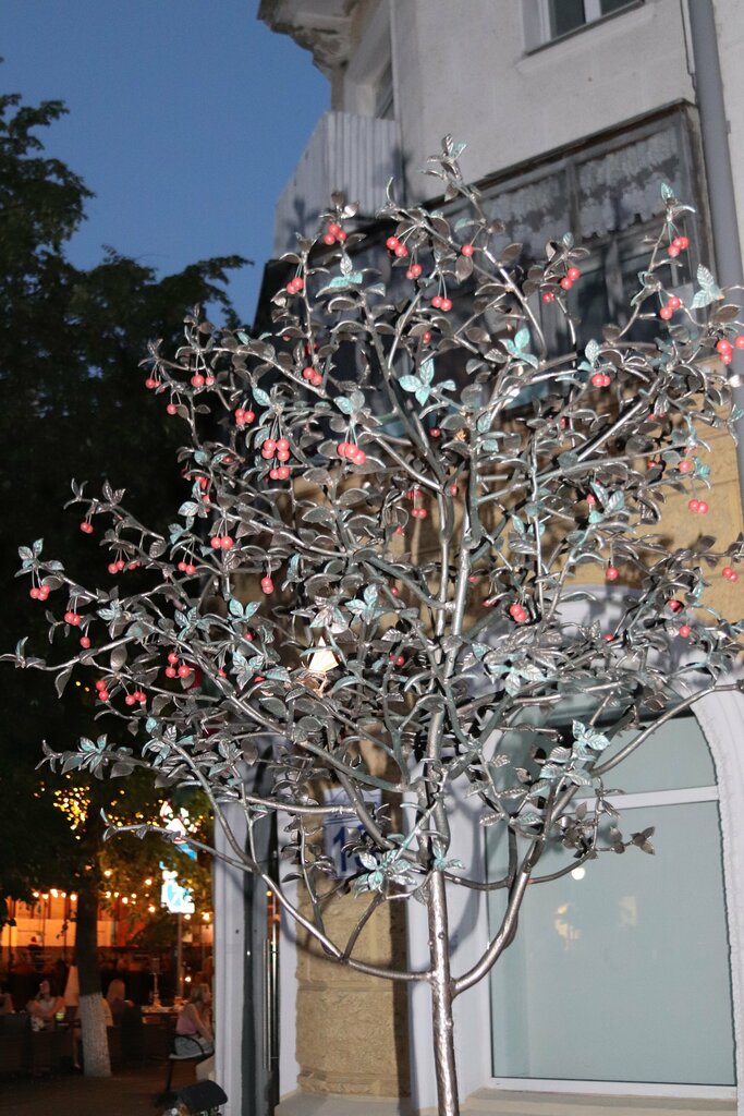 In 2022, as part of the improvement of Leninskaya pedestrian street for the celebration of the 755th anniversary of the city, a new art object was installed - a forged cherry. Previously, Leninskaya Street was named Bolshaya Sadovaya, so a fruit tree was chosen to decorate the pedestrian street. Decorative metal tree with graceful twigs, leaves and berry balls made of bearings and painted red. Every detail of the tree is handmade.