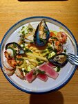 Отличное место для прохладного вечера осенью) Мы заказали оливье с крабовым мясом, креветкой и курицей. Нежный, соуса в меру, идеальное сочетание вкусов. Салат фахита - сочный и свежий благодаря овощам, нежные слайсы ростбифа и долька лайма. Вкусно, свежо 😍 Муж взял бургер-сочный , хорошо прожаренная котлета, достаточное количество соуса и мягкая булочка. Я взяла ассорти морепродуктов. Достаточное количество морепродуктов, вкусный соус и правильно приготовленные) Отдельное спасибо обслуживающему персоналу — официант София была очень вежлива, помогла с выбором блюд и оперативно реагировала на просьбы. Цены приятные, за такое качество и порции. Однозначно рекомендуем это место всем, кто хочет почувствовать вкус настоящего моря! Обязательно вернемся, чтобы попробовать пасту с морепродуктами и десерты ❤️