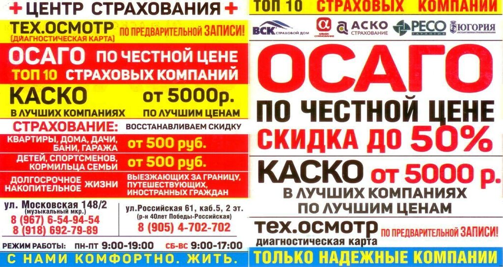 Cooperation with insurance companies:RESO-guaranty, ВСК, Ingosstrakh, Sogaz, Max, Soglasie, Renaissance insurance, AlfaStrakhovanie, Yugoria, Zeta Insurance, Tinkoff Insurance