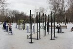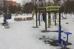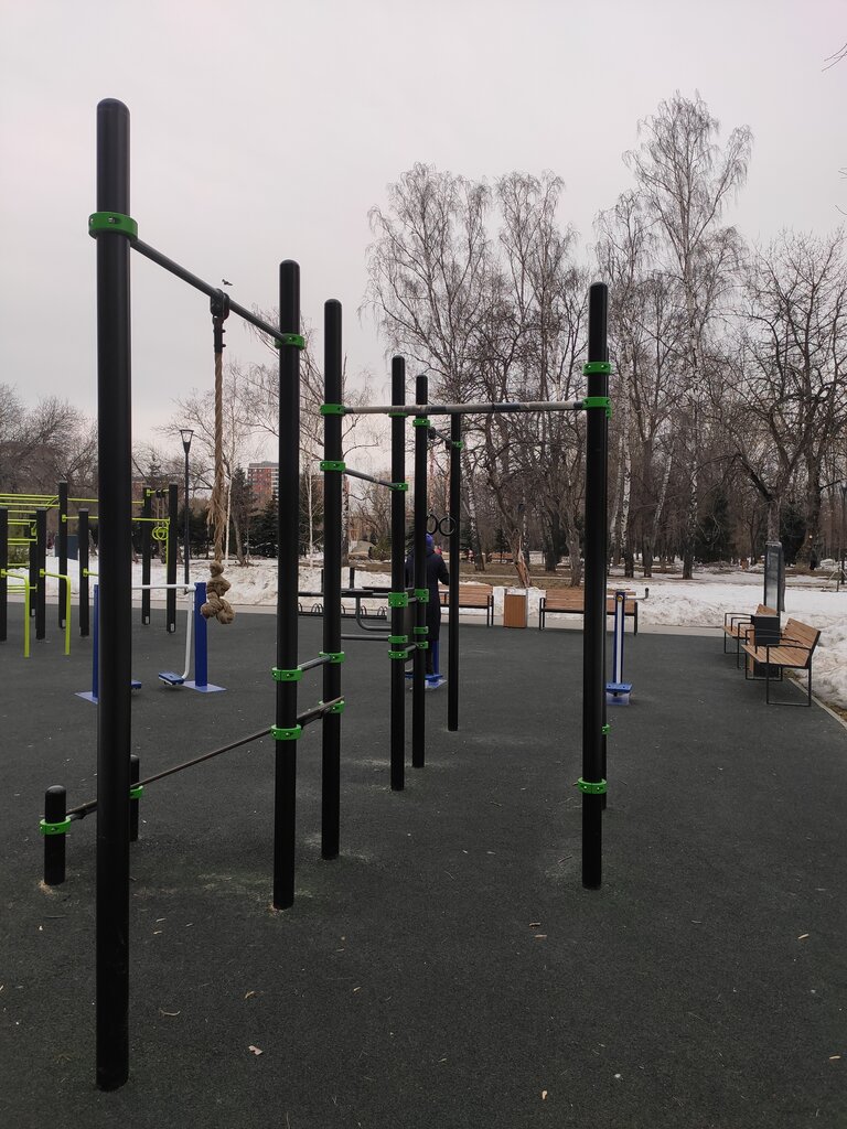 Большая современная площадка с турниками и различными тренажёрами не пустует, а привлекает всех желающих сделать спортивные упражнения.