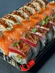 Ролл Калифорния с мурманским лососем, ролл с тигровой креветкой и татаки из тунца еллоуфин, ролл Филадельфия с тигровой креветкой, ролл с тартаром из тунца еллоуфин в соусе спайси, ролл с камчатским крабом и тигровой креветкой, Жареный ролл с мага...