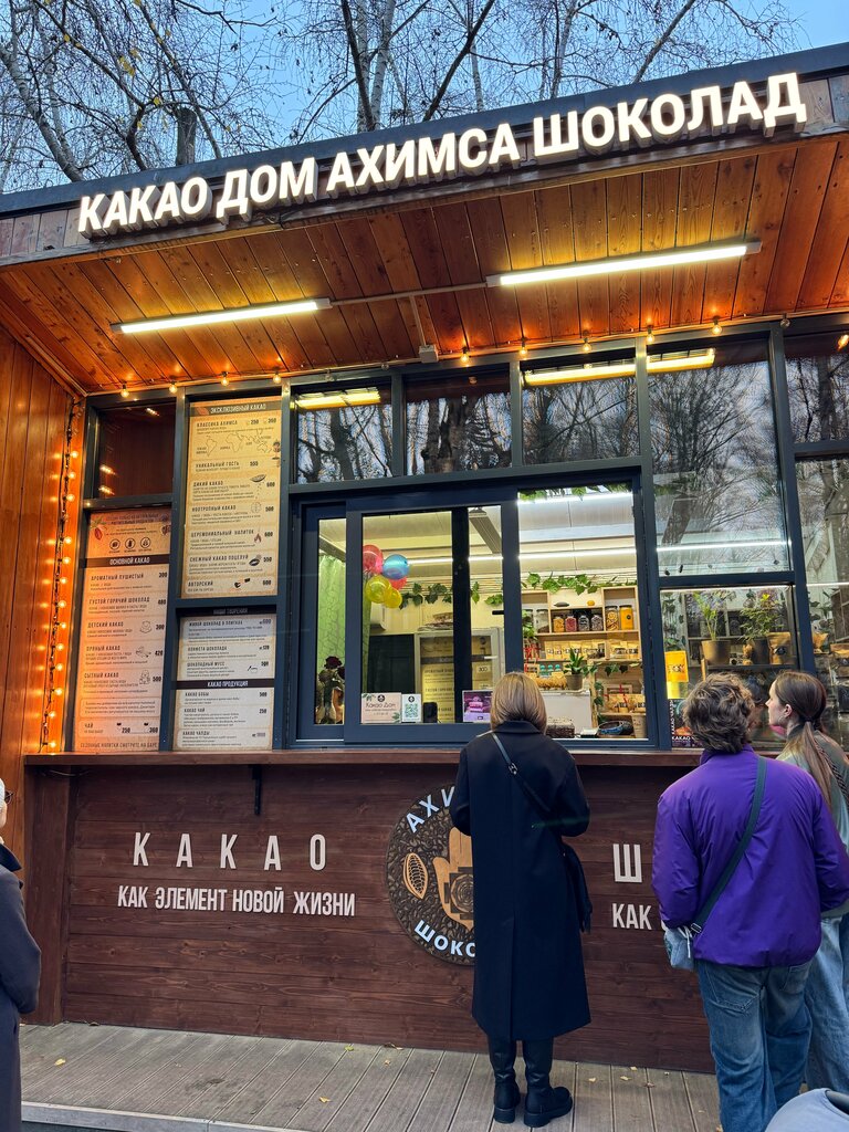 Вкусный какао, готовят персонально под каждого покупателя, поэтому ждать приходится довольно долго. Парк не разрешает собственникам установить скамейки, столики со стульями, поэтому долго стоишь в очереди, затем гуляешь с какао по парку. Сам какао вкусный, рекомендую покупать с пряностями, с добавлением каких-нибудь вкусов или сахара. Классический какао мало кто поймёт - не сладкий, горьковатый напиток, на любителя. Но бобы натуральные, поэтому прилив бодрости после такого напитка реально ощущается. Самый слабенький - детский какао. Шоколадные плитки довольно дорогие, но очень вкусные, рекомендую классический шоколад без наполнителей, он немного сладкий, очень приятный на вкус.