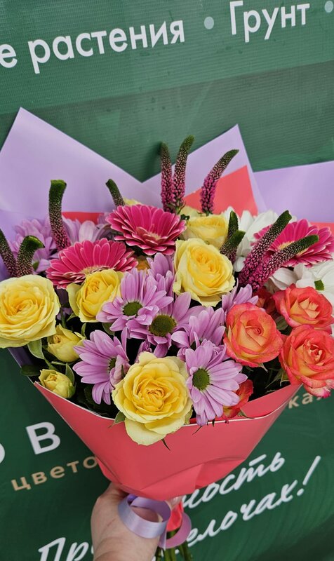 Привлекательный букет из кустовых роз, кустовых хризантем, гербер и вероники, под нежную упаковку.