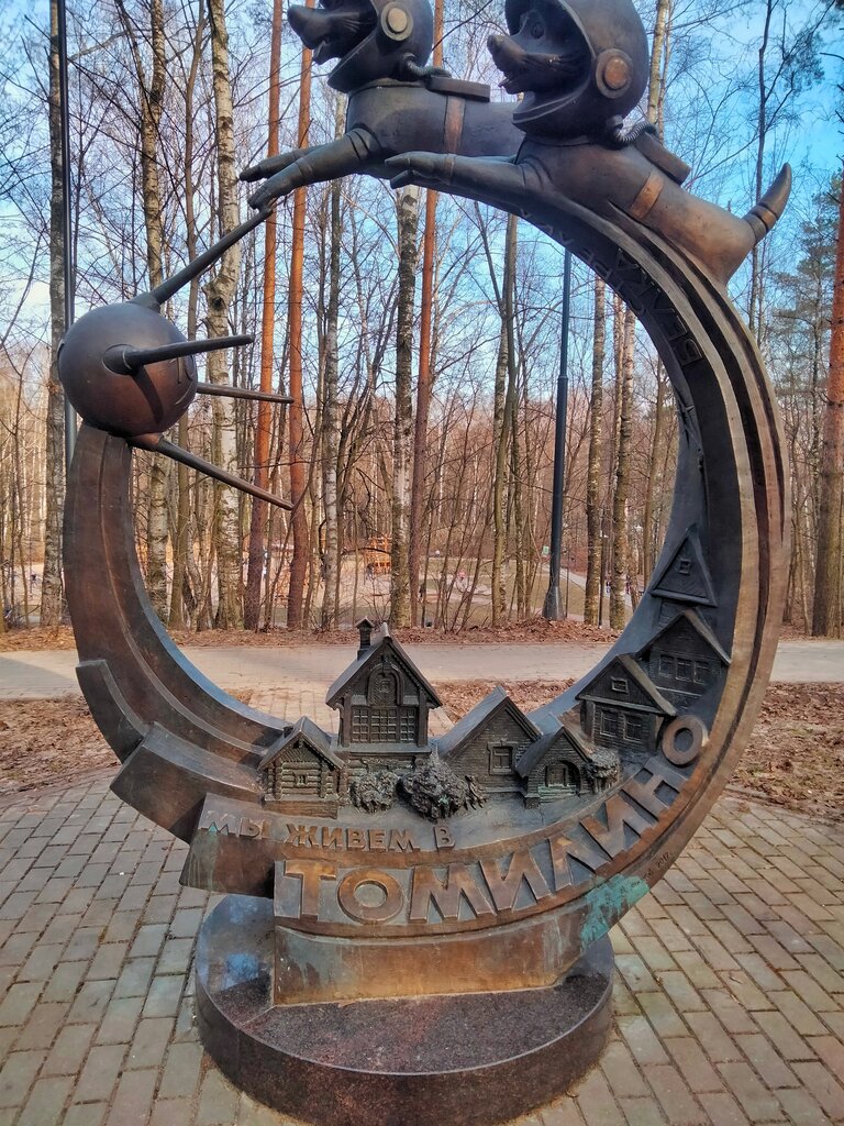 Скульптура посвященная Белке и Стрелке. Для тех, кто не знает историю развития космического пути России, скульптура может показаться странной, но именно в Томилино, на заводе «Звезда» имени академика Г. И. Северина (ранее — завод №918 Министерства авиационной промышленности СССР) создавались первые скафандры для космонавтов, в том числе для Юрия Гагарина.