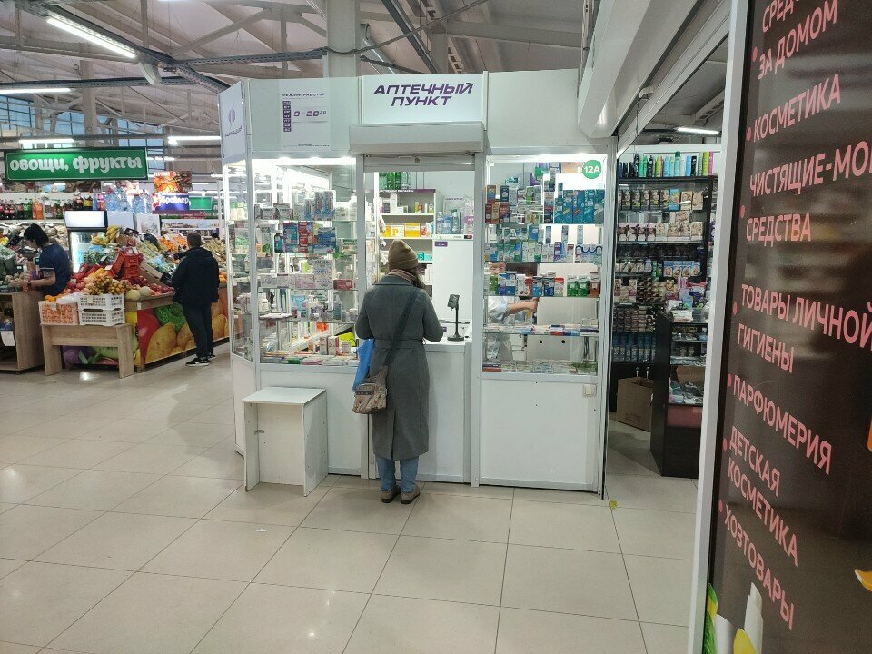Аптечный пункт. Хороший выбор без рецептурных лекарств. Режим работы как у рынка. Находится на рынке, можно и рыбку купить и от живота таблетку.
