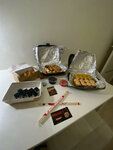 Variety of food:sushi and rolls, sweets, сhinese food