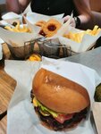 Крутые бургеры. Очень сочные и вкусные. Напитки дороговаты. Кортошка и луковые кольца топ. Заказываешь на кассе, заказ приносят за стол. В комплекте перчатки и салфетки для рук.
