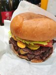 Бургер с двойной котлетой из мраморной говядины, сыром Чеддер, помидорами, маринованным огурцом, листьями салата, соусами сырный и копченный бaрбекю. Подается с хрустящим маринованным огурцом