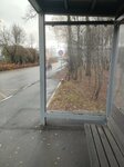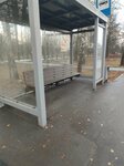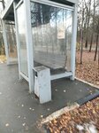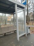 Остановка на окраине парковой зоны, выполнена из стекла, не расписана граффити, есть крыша над головой, лавочка, расписание движения автобусов.