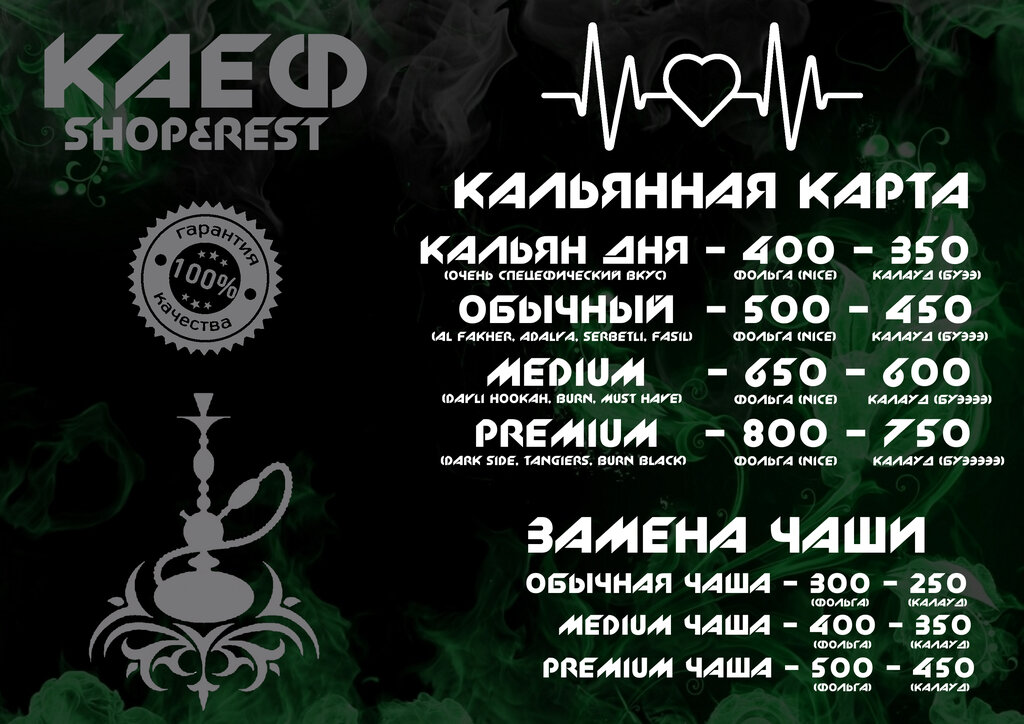 Персонал хороший, дружелюбный. Атмосфера супер, для такого заведения. Выносят кальяны быстро. Сами кальяны хорошенькие. Очень разнообразное меню напитков, как алкольных,так и безалкогольных. Хочу пожелать им терпения, доходов побольше и хотелось бы расширения,чтобы прям вау было для нашего городка. Вы лучшие❤️‍🔥