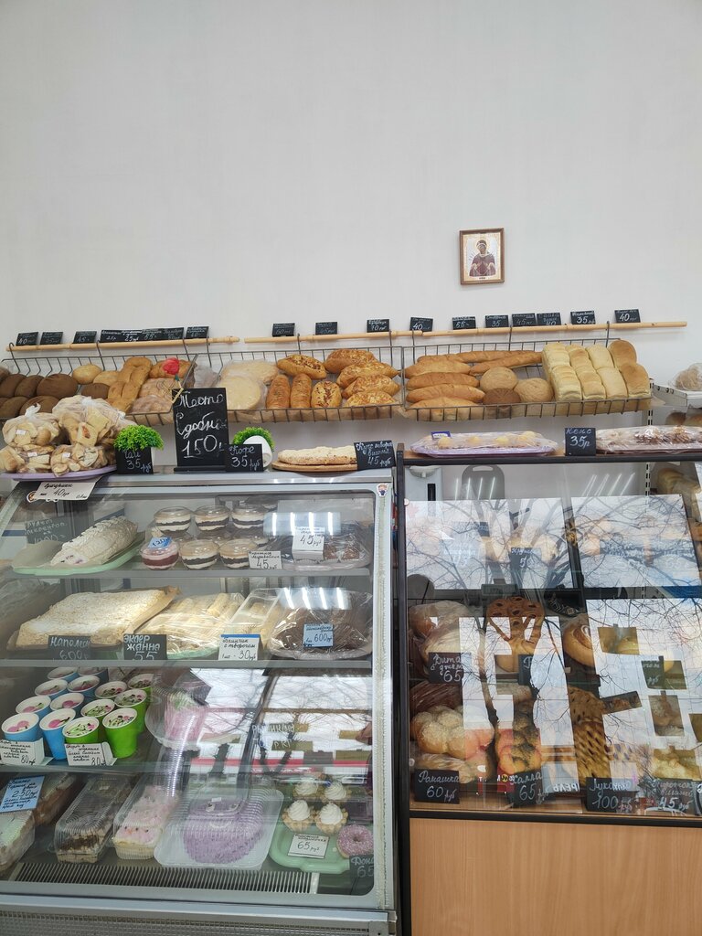 Магазин при частной пекарне. Много своей кондитерки - торты, тортики, кексики, рулеты, пирожные. Выпечка сдобная вкусная от пирожка до пирога. Можно чай попить и перекусить в магазине столик. Мы себе набрали, очень вкусный картофельный с луком и кукурузный с сыром , понравился чесночный батон. Пирожки печёные вкусные, и курник понравился. Цены не дорогие. Продавщица приветливая. Стоянка через дорогу напротив.