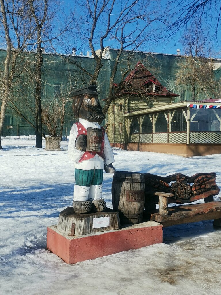 Весёлая композиция. Дядя Миша с кружкой, бочкой и скамейкой для гостей. Почему-то сразу на ум пришло, что его должны звать Дядя Миша. – Дядя Миша, хорош ли сегодня квасок? – А вот, подходи, налью кружечку, – сам попробуешь. И как к такому Дяде Мише не подойти.
