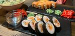 Variety of food:grill, sushi and rolls, pizza, burgers