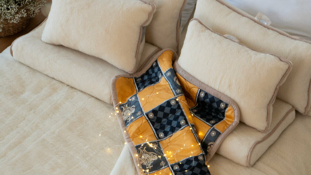 Подушка Валик-Рогалик из мягкой мериносовой шерсти с наполнителем «Термофил» сохраняет форму, обеспечивает комфорт и микромассаж шеи. Легкая, дышащая и влагоустойчивая - идеальна для отдыха дома, в дороге или на природе.
