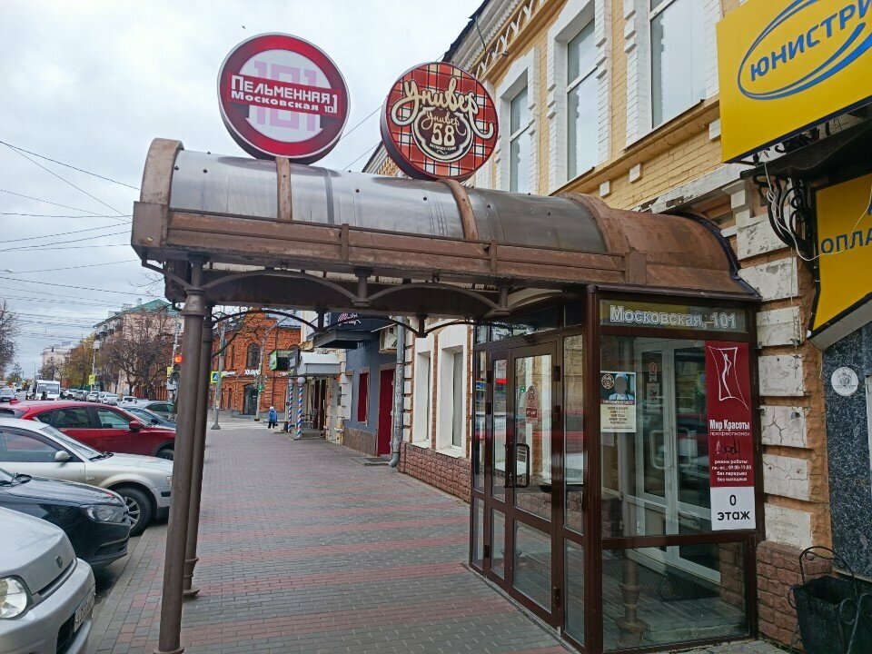 Недалеко от Суворова, вначале Московской, если идти в сторону холма с кафедральным Собором, расположена эта пельменная, внизу столовая Универ, а на втором этаже пельменная. При входе лестница на 2 этаж, атмосферный интерьер, есть что по разглядывать и вкусные пельмень, прям реально домашние, подаются в интересных картонных коробках, штук по 12-15, можно брать с собой, очень удобно, если ешь у них, то дают тарелки, пельмени хорошо промаслены, поэтому не слипаются. Есть вариант с бульоном, но мы не брали, как это подают незнаю. Два вида куриные и мясные, варианты разные отварные, жаренные, запеченные в сметане ( их тоже не брали) . По итогу взяли три порции салата, куриные 1 порция, 2 порции мясных, порция варенников, порция мясных жаренных, 2 порции сметаны, сырный соус, три компота и заплатили 1500₽, наелись очень сытно на троих. Очень рекомендую это место. Чисто, интересно и очень вкусно. Кроме пельменей есть и другие блюда, гарниры, котлетки, сосиски, но нам хотелось пельмени.