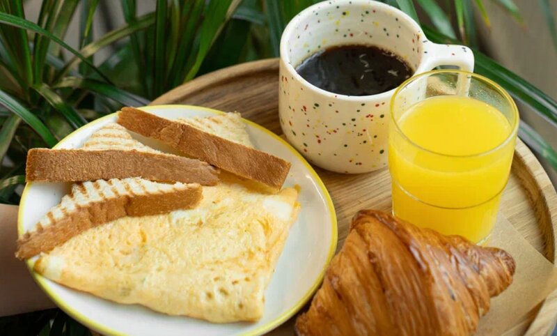 Хлеб тостовый, яйцо куриное, ветчина, помидоры свежие, сыр чеддер, бекон, салат айсберг, яйцо куриное, соус цезарь