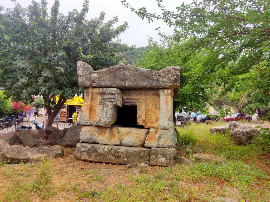 There are many different Lycian tombs and sarcophagi in the cities of Turkey. Tombs are structures carved into the rock, and sarcophagi were made of large boulders already on a flat surface. The latter option is shown in the photo. Everything was used as for the burial of noble people, moreover, some sarcophagi were of enormous size and resembled crypts. Several generations of the family could be buried there along with various luxury items. Today, everything has long been opened by looters and looted.