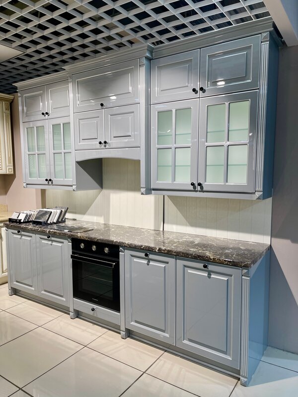 Кухня «Мишель» — 2,8 м Элегантная классика, которая всегда в моде. Глянцевая эмаль, фрезеровка, декоративные пилястры и серебряная патина создают ощущение лёгкого блеска и уюта.