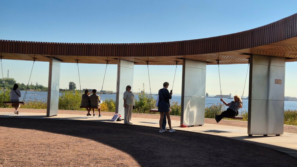 Эти интересные панорамные качели находятся на Острове Фортов. Место очень классное для прогулок. Много всего интересного, как для детей так и для взрослых. Вицентре панорамных качелей находится маяк памяти с фамилиями погибших.