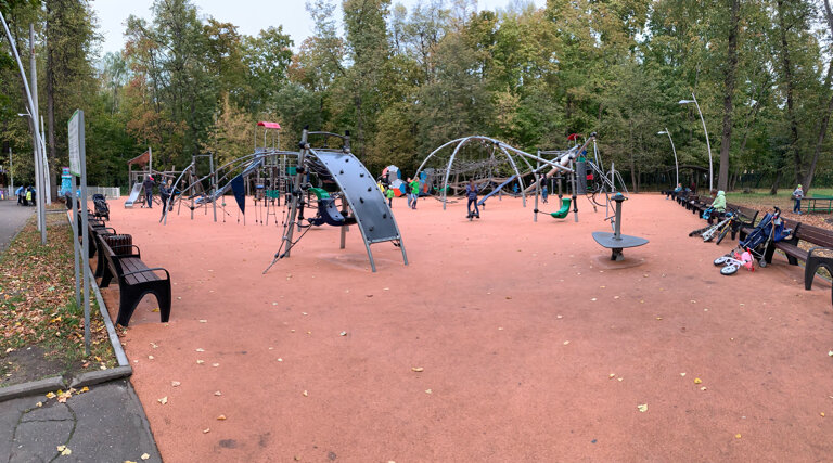 Вот та самая площадка из моего предыдущего отзыва)) Это самая большая и классная площадка во всем парке. Все остальные маленькие и не очень интересные. На фото видно, что много разных лазилок и качелей. Территория большая и огорожена от парка забором. Рядом есть несколько аттракционов и платный городок, палатки с едой, кофе, а также крытый каток. Дети эту площадку обржают.