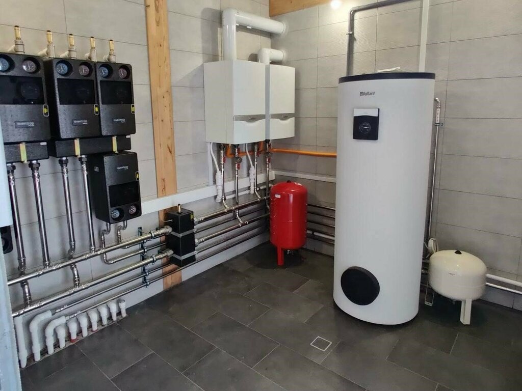 Включает прокладку трубопроводов, монтаж бойлера, его обвязку, подключение к котлу, подключение к водопроводу, подключение к рецикркуляции, монтаж насоса рециркуляции.