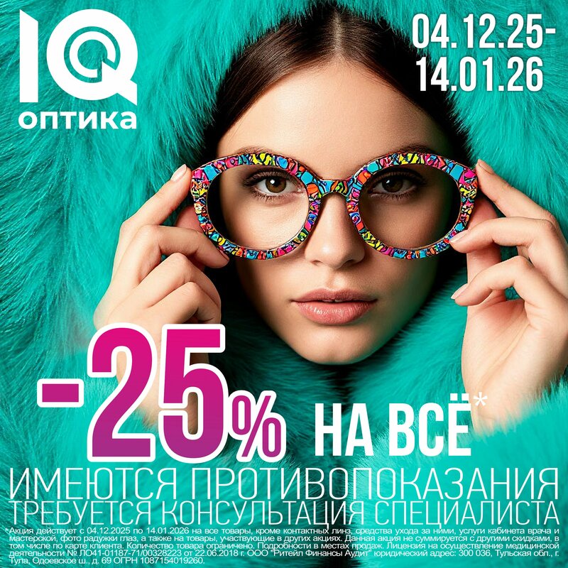-25% на все! Скидка действует с 04.12.25 по 14.01.26 на весь ассортимент медицинских оправ и очковых линз, кроме мягких контактных линз, сре...