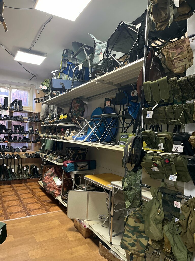 Классный магазин. Ассортимент хорошего военторга и не только. Даже пехотные лопатки есть. Рюкзаки , спасжилеты и прочее. Отличные внимательные продавцы. Оплаты по безналу нет. Только наличные.