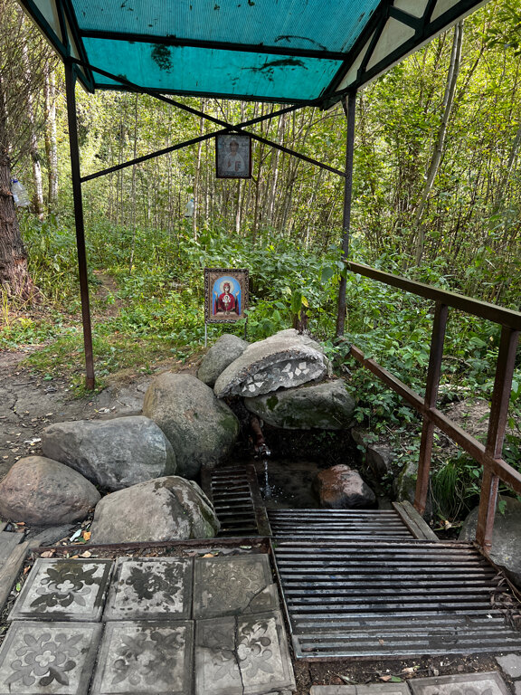 Вода не самая лучшая, но вполне себе сносная. От дороги идти далековато, особенно если с большими бутылями. Основной плюс - хороший напор. На фото с навесом совсем другой родник, поэтому искать этот навес в данном месте бесполезно, тем более сам родник с дороги вообще не видно и он без какого-либо навеса. Чтобы добраться, нужно довольно долго (метров 150) идти по тропе между речкой и прудом, удаляясь от дороги. Пруд, собственно, и образован данным родником, поэтому пункт назначения будет на его противоположной стороне.