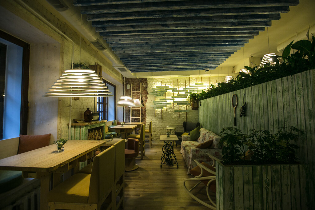 Интерьер на пятёрку: уютно, необычно, качели и кресла-качалки, столы из швейных машинок Зингер. Не ожидала, что меню полностью вегетарианское, но наелась. Вкусно, красивая подача. Цены не кусаются. Были с дочкой. Остались под приятным впечатлением, а вот с мужем не пошла бы - останется голодным.