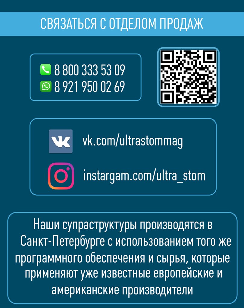 Компания «Ультрастом» зарекомендовала себя как надёжный партнёр в сфере производства протетики и предоставления качественных услуг. Мы довольны сотрудничеством с Ультрастом. Компания предлагает широкий ассортимент протетики для различных систем имплантатов. Они всегда готовы предложить индивидуальные решения, учитывая потребности клиента. В целом, мы очень довольны работой с Ультрастом и рекомендуем её всем, кто ищет надёжного партнёра для сотрудничества в сфере производства качественной протетики для имплантатов, а также решений для стоматологий.