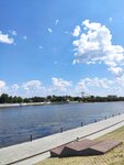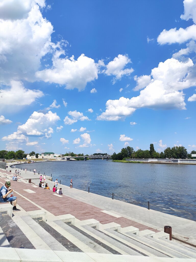 Приятная для прогулок набережная с пешеходным мостом. Есть прогулочные катера на 10-12 человек, поездка 600₽ на 40 минут, освежает в жаркий день! Кафе с мороженым