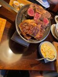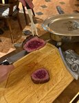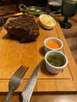 Аргентинский стейк-хаус El Gaucho. Визитная карточка — конечно, стейки, в том числе в интересных подачах с доведением до готовности прямо в зале.  Ресторан знаем почти со дня его основания, и периодически заходим туда именно на мясо! В этот раз я как-то особенно сильно захотела субпродуктов. И на этот случай в ресторане есть супер блюдо: фирменное ассорти мясных деликатесов для настоящих гурманов (да-да, это я). В ассорти есть такие вкусности как бычьи яйца, печень, язык, почки… ммм, кто в теме, тот поймёт! Подают красиво: к столу подвозят тележку с приготовленными «аль денте» деликатесами, и оставляют их доходить на специальной сервировочной сковороде, под которой находятся горячие угли. То есть таким образом каждый деликатес можно довести до желаемого уровня прожарки именно за столом. Ассорти большое, 700гр. Сын, любитель классики, взял роскошный стейк филе. Который так же привозят на тележке и сервировочной сковороде, и доводят до нужной прожарки уже за столом. Тар-тар из говядины тоже из фирменного. Официант готовит его непосредственно у столика, добавляя ингредиенты по пожеланиям гостей. Я еще взяла зеленый салат, в качестве гарнира к вкуснейшему мясу. Сын выбрал картошку фри. Домашний хлеб с маслом идет комплементом Без десерта тоже не обошлось - шоколадный фондан. Помимо этого, гордость ресторана — большая коллекция вин Старого и Нового света.  Да вообще атмосфера в ресторане классная, такой «мужской мясной вайб».