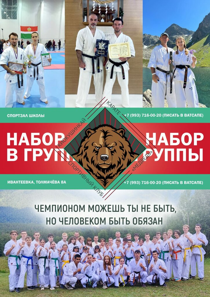 Отличное место. Тренер профессионал. Киокушинкай карате Ивантеевка! Спортивный клуб "Медведь". Ходим уже второй год, отличные тренировки, участие в соревнованиях и тренировочных сборах. Выезд в летние и зимние лагеря.