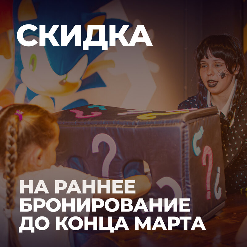 - на 5 детей - Игровое шоу с аниматором / квест (40 минут) - Воздушный фонтан из 7 гелиевых шаров - Посещение Сласти и пиксель парка.
