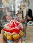 Ванильная гонконгская вафля, шарик клубничного мороженого, взбитые сливки, конфета красное , клубника ,розовая посыпка, клубничный топинг.