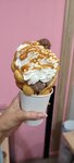 Ванильная гонконгская вафля,шарик шоколадного мороженого , взбитые сливки, конфета Сникерс, дроблёный арахис, карамельный топинг.