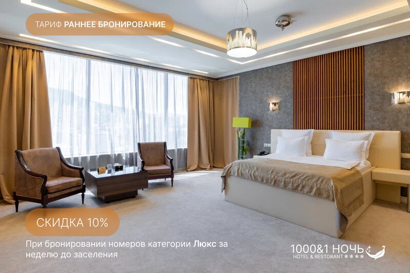 Уютный Двухместный номер в отеле "1001 ночь" — это идеальное сочетание комфорта и функциональности, где вас ждет просторная спальня с ортопедическим матрасом и панорамным видом на город, современный совмещенный санузел с душевой кабиной, набором к...