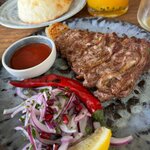Не понравилось хачапури по аджарски оно было сыровато, шашлык из телятины был мягким, но как будто в киви передержали (кто знает поймет), бараньи семечки на фото (они должны быть маленькими, но не микро), салаты были хорошие, вот что разочаровало это голубцы, купите чтобы понять как не нужно готовить. В общем знаю этот ресторан с открытия, не был года два в нем, раньше был ресторан для людей, сейчас как будто для туристов иностранцев, люди которые второй раз не зайдут. Уж простите владельцы, но честно накипело пока у вас был, за немалые деньги такие косяки. Да и уберите сахар, соль, перец со стоек на уровне людских коленок, все таки летит пыль и грязь!