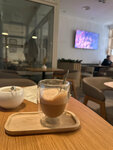 Кофе не очень: Капучино в прозрачном стакане, с большим количеством пены и горчит. Обстановка хорошая, есть вайфай 👍🏻
