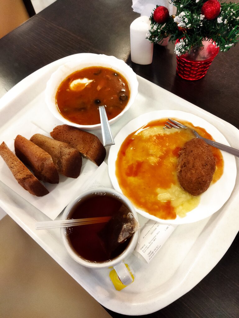 Для столовки в больничке оочень прилично, ценник оочень демократичный. Разнообразное меню, много салатов, десертов, первые блюда, выпечка. Понравилась котлетка «стюардесса..» Как-то ее и очень понравился творожный чизкейк, правда он редко бывает. Вежливый персонал, заботливые дамы. Единственное, видела не домытые кружки со следами от помады. Думаю в посудомойке не отмылись Атмосфера для столовки 4+ Еда 4,5 Интерьеры для столовой 4 Правда работают до 16