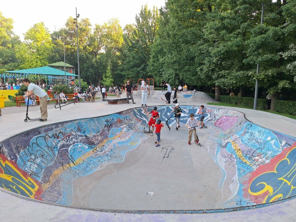 As far as I understand, this is not really a skate park, but rather a bike stunt area with jumps, sharp descents, ascents, turns. Maybe at another time, there are skaters there too. I was at the time of the cycling freestyle competition (I'm not strong in terminology, maybe this is not quite the right name). The presenter voiced the names of the bike pirouettes, the competitors tried to complete these tasks. The performances were evaluated by the audience and the presenter. Musically, everything was accompanied by a modern beat. It would be fun, interesting, there are a lot of spectators and fans.