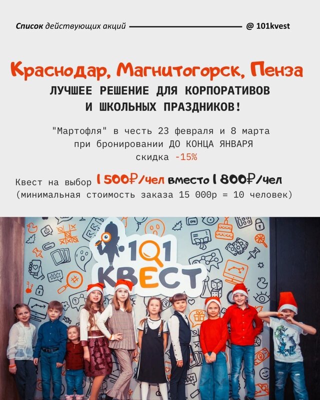 🎁 Наши акции в 101 квест до конца января 🎁 1. Лучшее решение для корпоративов и школьных праздников! "Мартофля" в честь 23 февраля и 8 ма...