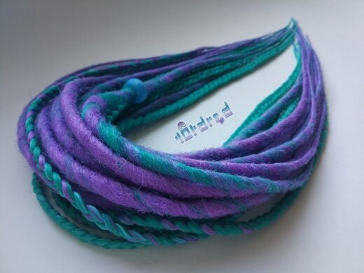 Всего 20 штук: 13 мелированных ДЕ дредов + 7 ДЕ кос (+ бонусная дрединка). Концы свободные. Длина 20-30 см. Цвета: морской волны, голубой, сиреневый. Для вплетения на андеркат (затылок и виски выбриты), либо на затылок.