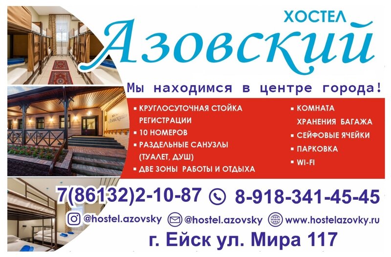 Единственный хостел в Ейске, чистый, свежий, хороший. Постельное белье, простынь и наволочка заранее для вас уже постелены. Уборщица каждый день убирается. Работают 24/7, администратор всегда там, чтобы зайти ночью, надо позвонить по телефону. Есть сразу два выхода, можно выйти на главную улицу и немножко совсем пройти до магазина. До моря по прямой пешком либо на такси 280 ₽ примерно. В общем, супер. Единственное печальное, что нет морозилки.