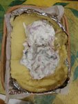 Цельный запечённый в фольге клубень картофеля, замешанный на основе сыра.