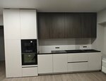Кухня выполнена в стиле современного минимализма с элементами неоклассики. Гарнитур расположен вдоль одной стены с переходом в высокую колонную зону, что создаёт аккуратную архитектурную линию и освобождает пространство для обеденной группы и остр...