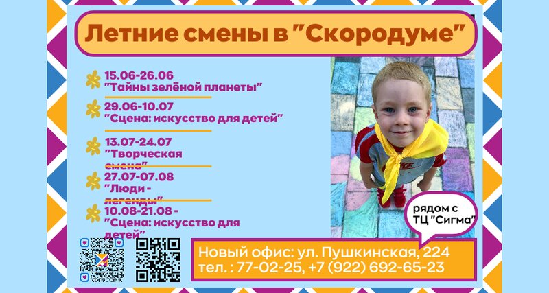 Сын 2 года посещал занятия по раннему развитию Шичида! Видим с мужем как меняется ребенок и очень довольны. А в этом году посетили летний лагерь, смены с 07-20 июля. Хочу сказать спасибо огромное, всем причастным к организации лагеря! Руководству "Скородум", тренеру Анастасии, и вожатой Марии. Моему сыну всего 5 лет, садик закрылся на 6 недель и ребенку было оооочень скучно дома. Скородум знаем давно, ходим туда на развивашки, и вот увидели, что летом туда набирают в летний лагерь и без раздумий записались. Конечно было волнительно, детки были старше сына, а вдруг не понравится, а вдруг... а вдруг.... Но все сомнения развеяли методологи и педагоги. Рассказали, как будет все организовано, что будут фотоочеты и обратная связь от педагогов. И мы ни разу не пожалели, спасибо за атмосферу которую создали внутри лагеря, а какие классные туда пришли детки, так здорово было слушать рассказы сын, с кем познакомился, играл, что нового узнал и как провел день! Если раздумываете - не думайте, приходите!