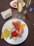 В целом шведский стол неплох, особенно завтраки. Шампанское трех видов на завтрак - это тоже плюс. Все время также брали яйцо пашот с красной рыбой - нам это очень нравилось. На обед и ужин наливают свежее разливное пиво трех видов - это плюс, пил с удовольствием. А вот вино в бокалах на барной стойке - весьма посредственное. По выходным можно налить себе вина из бутылок - оно получше. На обед и ужин ассортимент в целом нормальный, говядина вкусная, курица неплохая, но со свининой и бараниной просто беда - они жесткие и невкусные. Если повысить их качество, то еда существенно улучшится. Официанты стараются и быстро убирают со столов грязную посуду. Бармен приветлив и быстро наливает пиво. Много разнообразной выпечки, много солений, всегда есть фрукты. В общем, твердая четверка и есть, что улучшить.