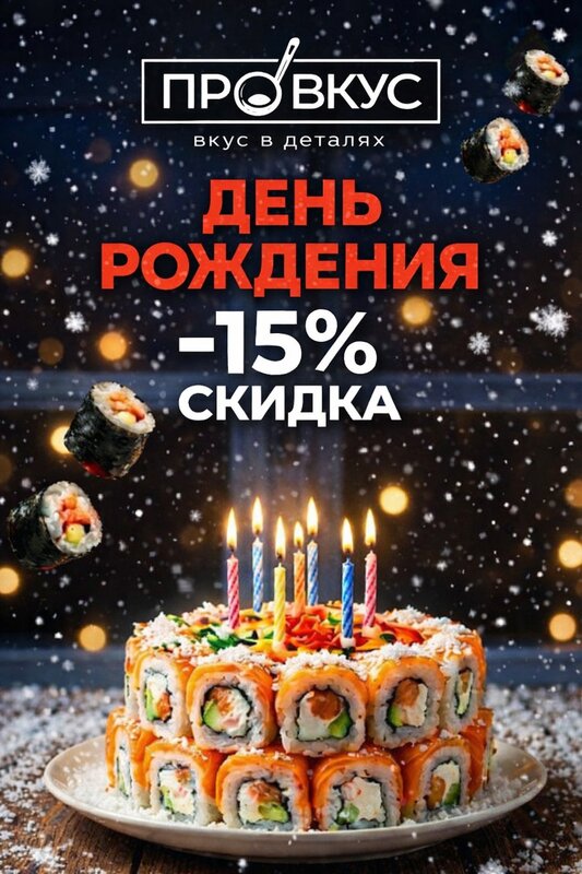 День рождения с ПроВкус — выгодно. Дарим скидку 15% ко Дню рождения на доставку и самовывоз. Отличный повод порадовать себя и близких любим...